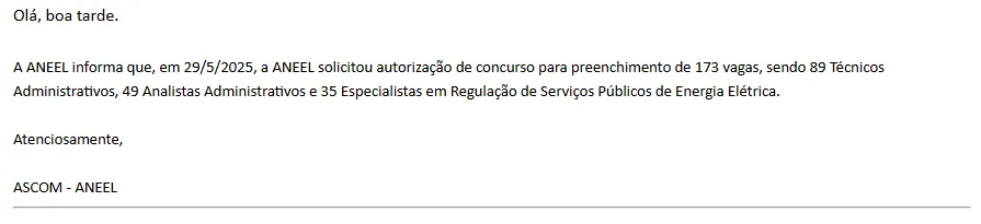 A Agência Nacional de Energia Elétrica solicitou um novo concurso com 173 vagas para cargos administrativos e de especialistas, aguardando autorização do Ministério da Gestão e da Inovação. Enquanto isso, o concurso via CNU 2024 prossegue com nomeações e formação de novas turmas.